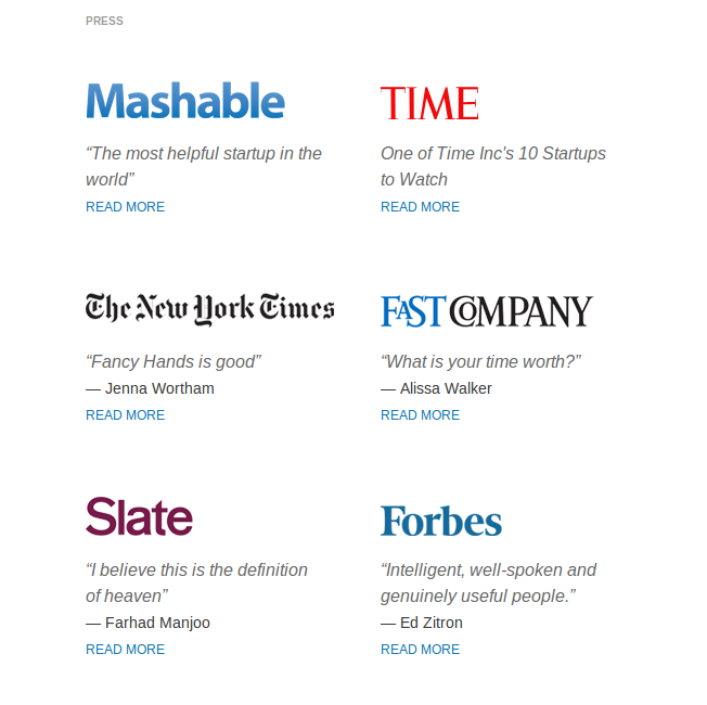 Fancy Hands displays the publications that covered them along with the quotes. Adding the quotes gives Fancy Hands more credibility than if they used just the logo. It means a lot more when, in addition to showing the Time Magazine logo, you proclaim that Time called you “One of 10 Startups to Watch.”